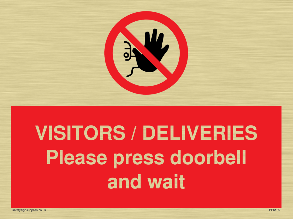 Sign Text: VISITORS / DELIVERIES Please press doorbell and wait