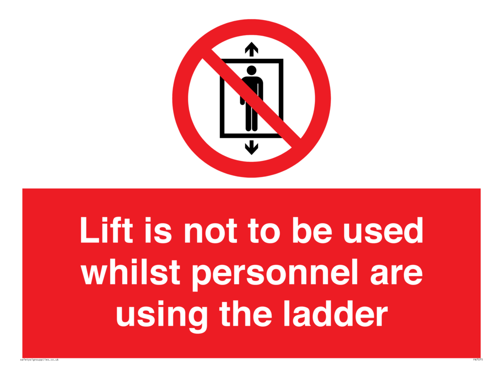 This sign contains a do not use lift symbol. Lift in black within red circle with diagonal line crossed through.
