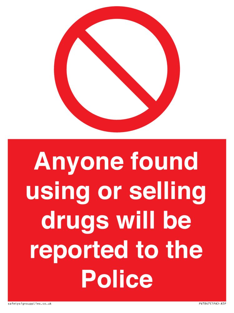 Sign Text: Anyone found using or selling drugs will be reported to the Police
