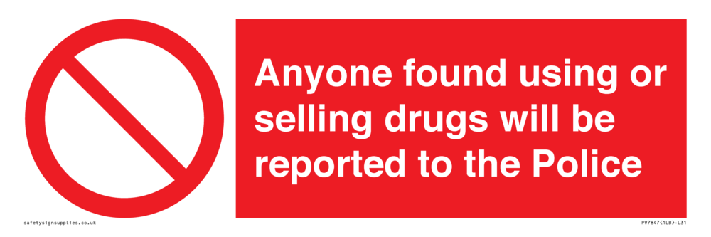 Sign Text: Anyone found using or selling drugs will be reported to the Police
