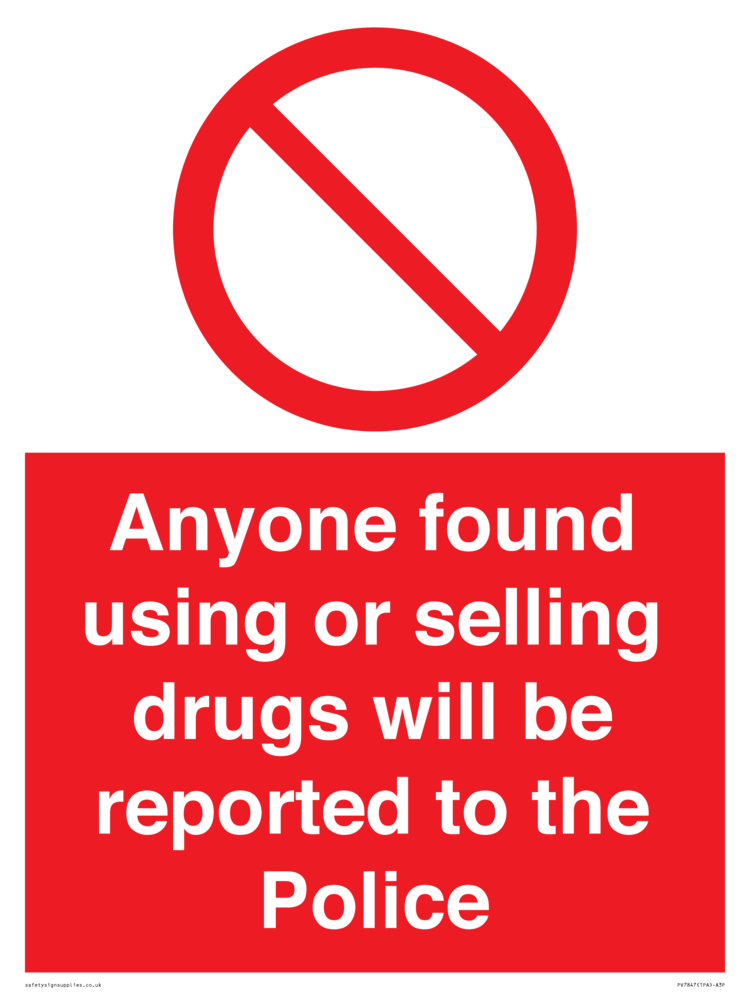 Sign Text: Anyone found using or selling drugs will be reported to the Police