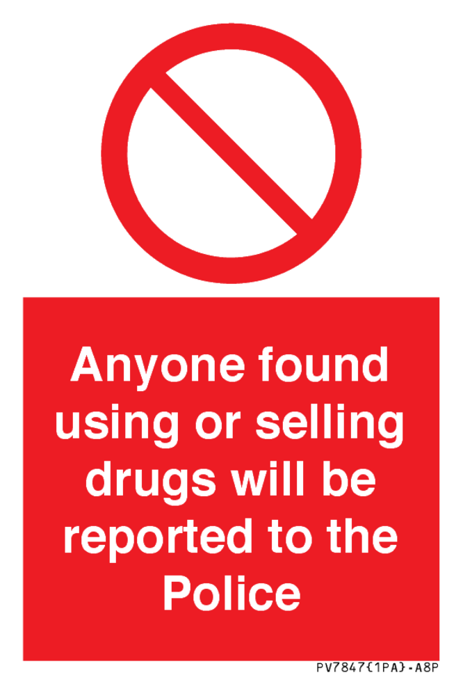 Sign Text: Anyone found using or selling drugs will be reported to the Police
