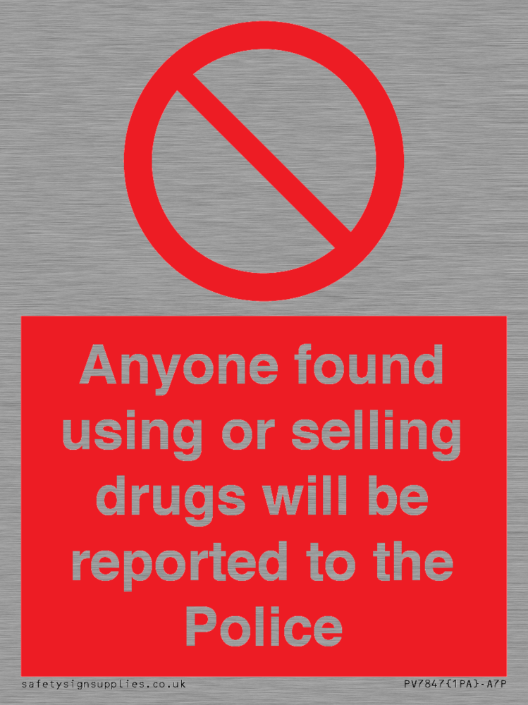 Sign Text: Anyone found using or selling drugs will be reported to the Police
