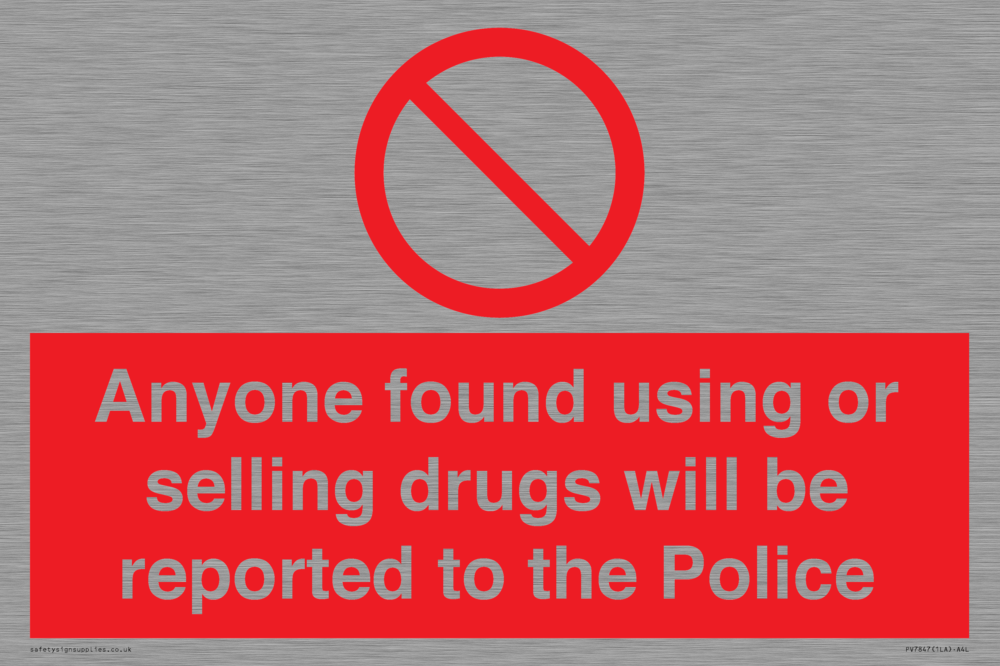 Sign Text: Anyone found using or selling drugs will be reported to the Police