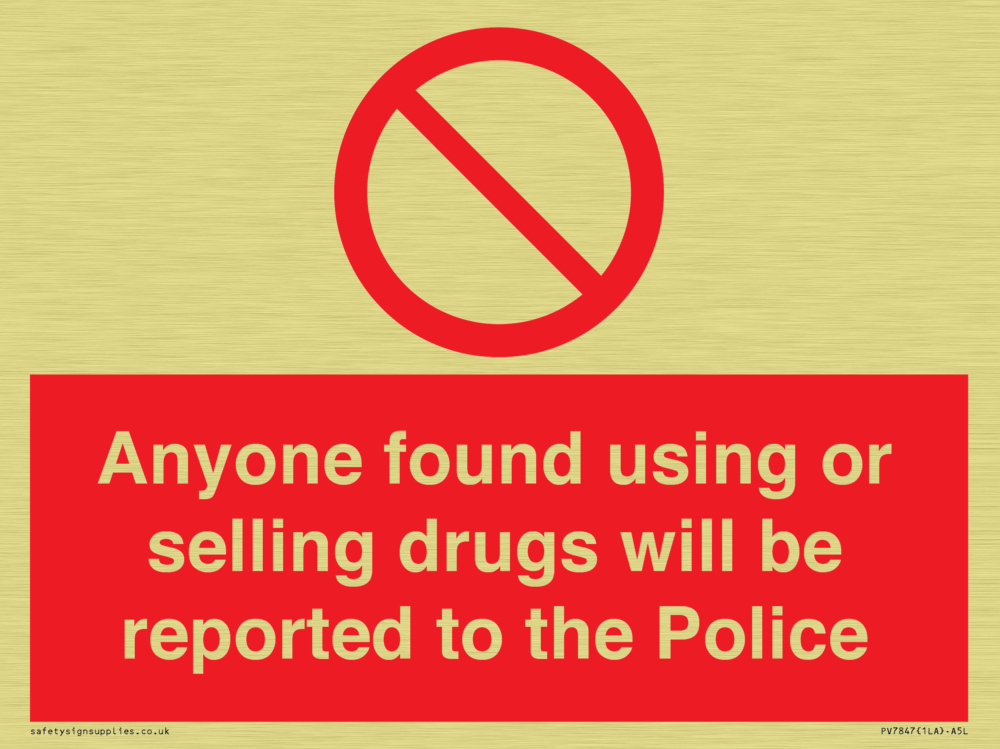 Sign Text: Anyone found using or selling drugs will be reported to the Police