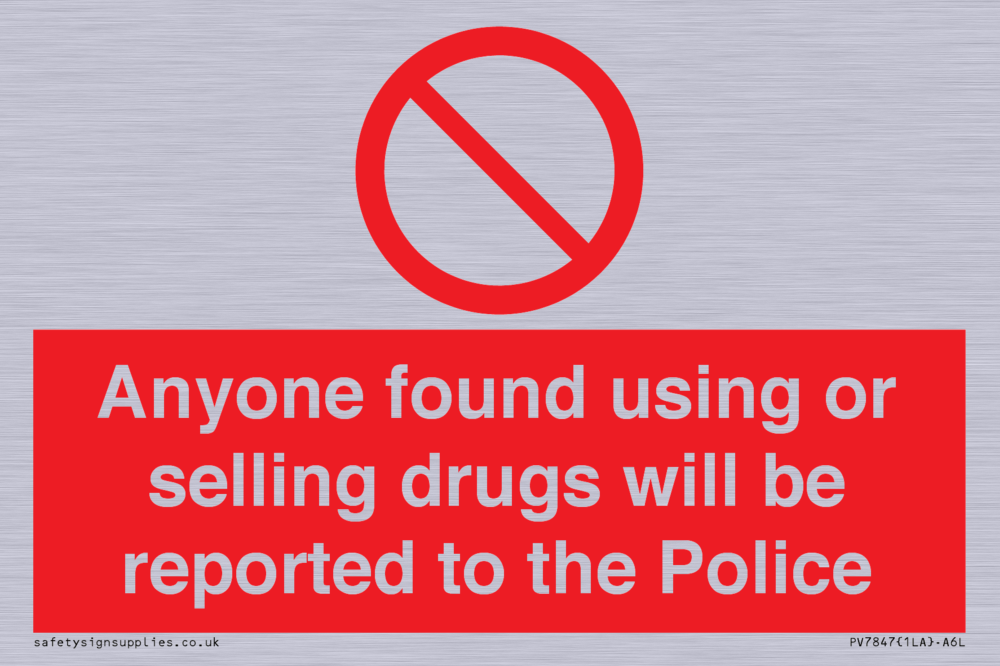 Sign Text: Anyone found using or selling drugs will be reported to the Police