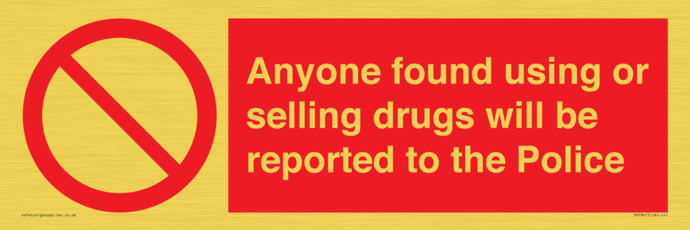 Sign Text: Anyone found using or selling drugs will be reported to the Police