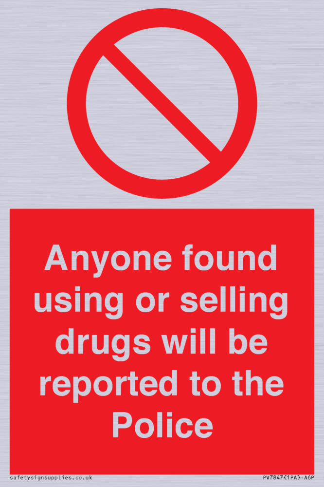 Sign Text: Anyone found using or selling drugs will be reported to the Police