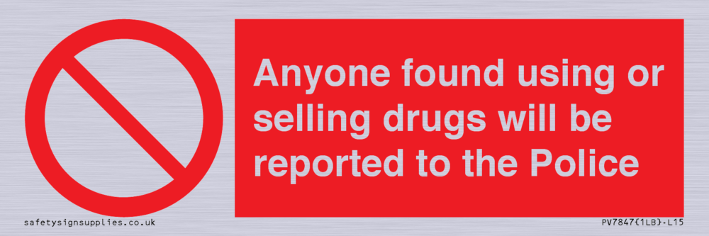 Sign Text: Anyone found using or selling drugs will be reported to the Police