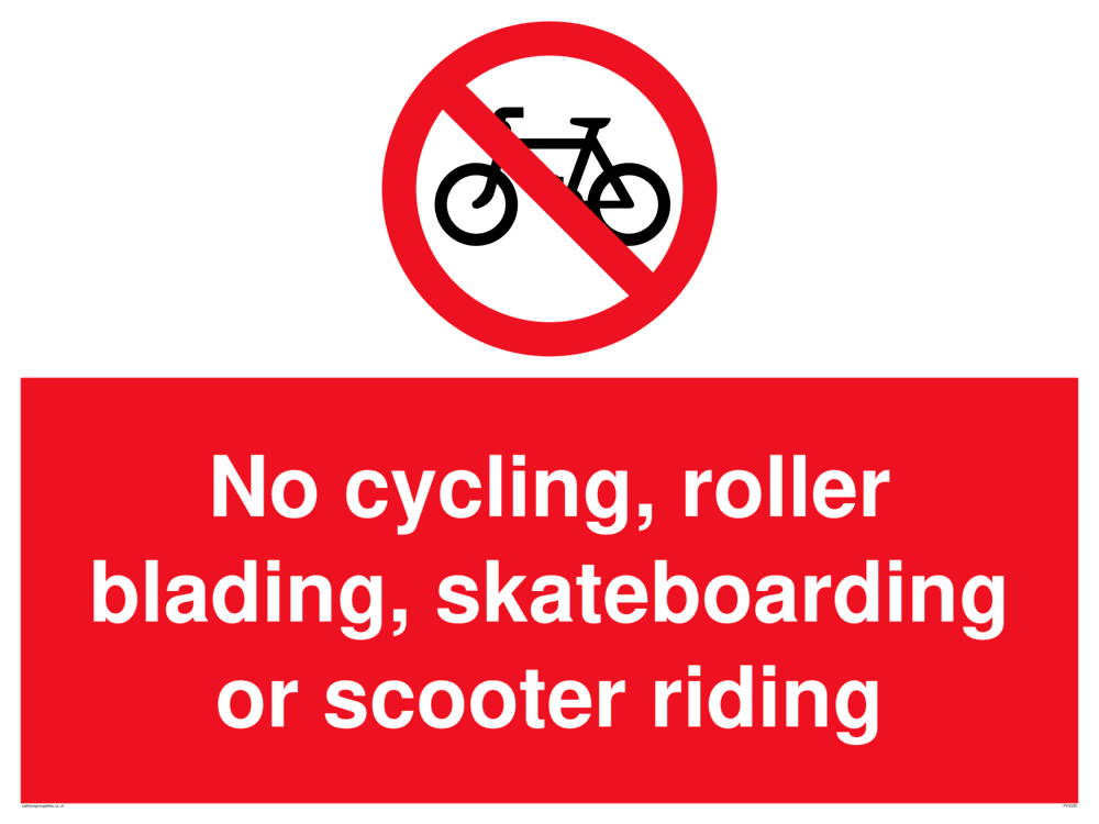 This sign contains a no cycling symbol - bicycle in black with red circle crossed through.