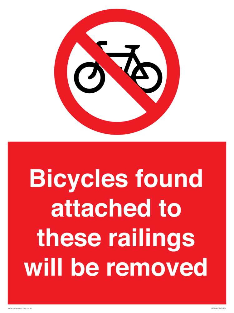This sign contains a no cycling symbol - bicycle in black with red circle crossed through.