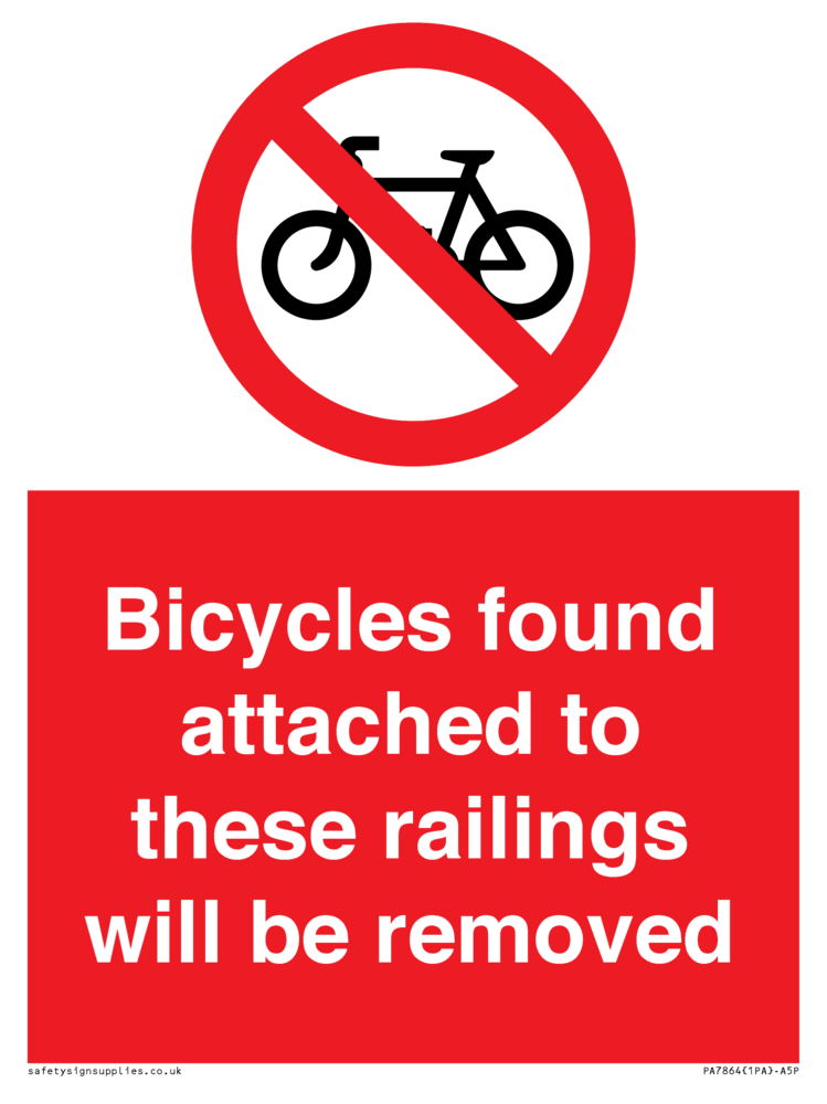 This sign contains a no cycling symbol - bicycle in black with red circle crossed through.