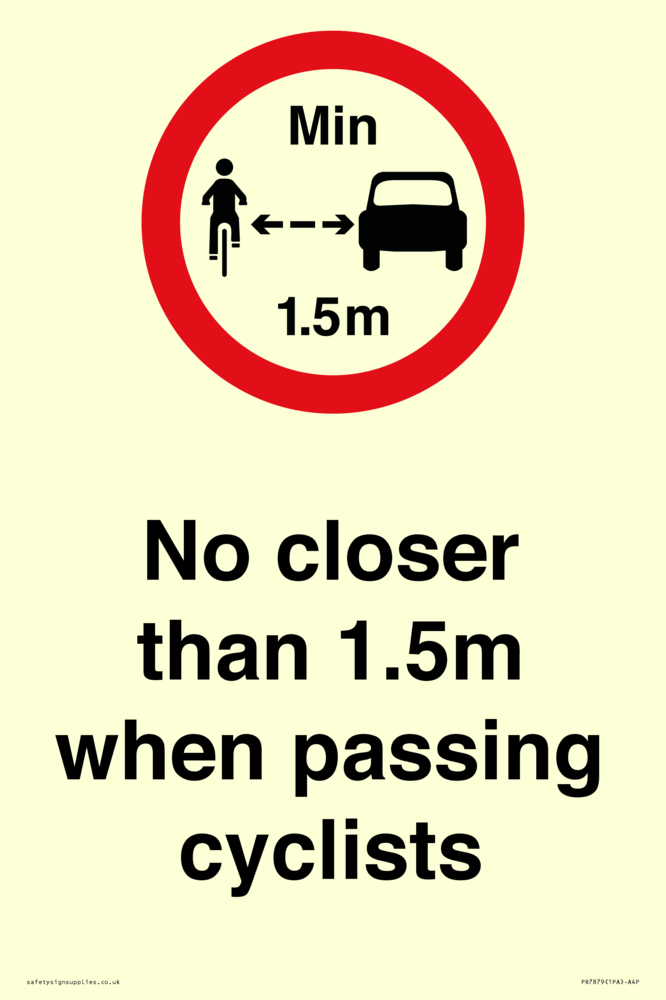 Sign Text: No closer than 1.5m when passing cyclists Dimensions: 200x300mm Material: Vinyl Photoluminescent sticker Orientation: Portrait Text Colour: Black Background Colour: White More...