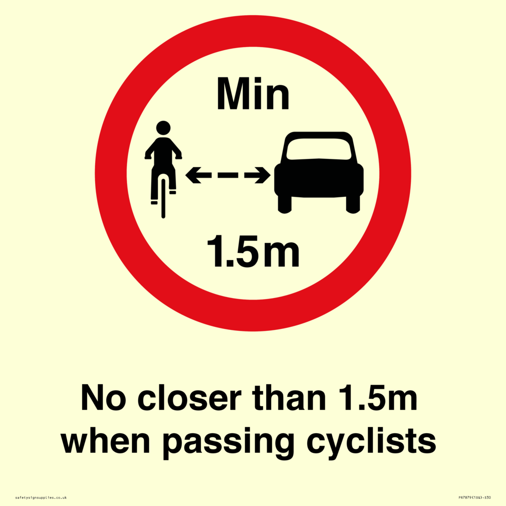 Sign Text: No closer than 1.5m when passing cyclists Dimensions: 300x300mm Material: Vinyl Photoluminescent sticker Orientation: Square Text Colour: Black Background Colour: White More...