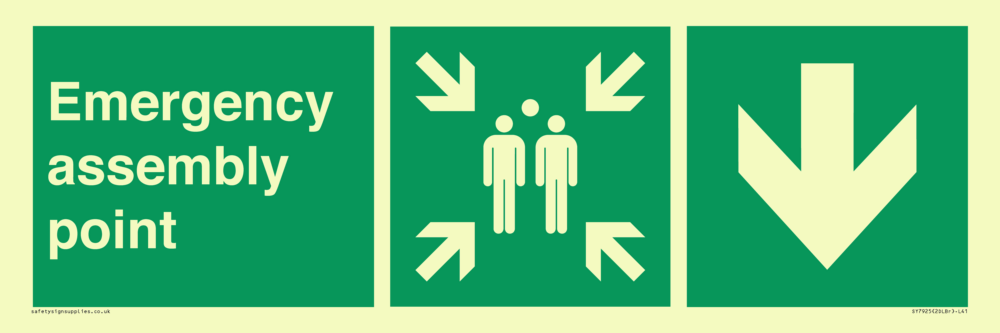 Sign Text: Emergency assembly point directional Down arrow