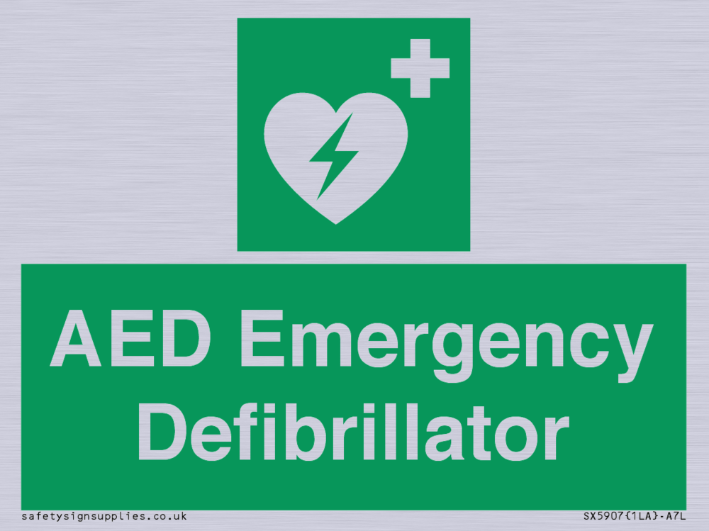 Sign Text: AED Emergency Defibrillator Dimensions: 100x75mm Material: Plastic Semi-rigid Silver Orientation: Landscape Text Colour: White Background Colour: Green More...