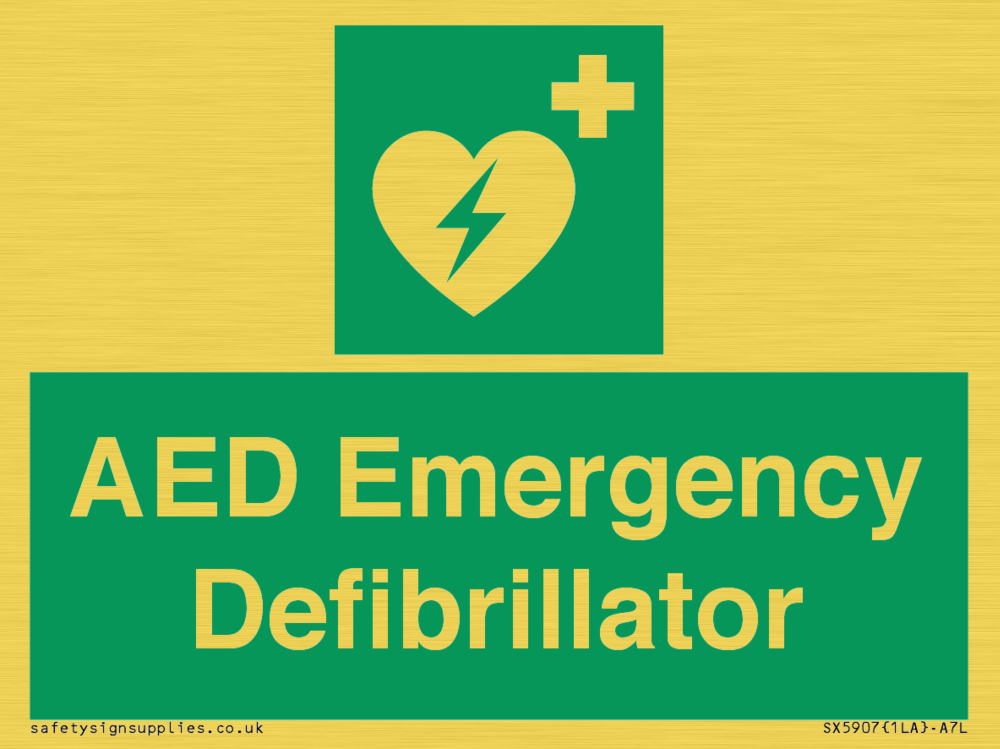 Sign Text: AED Emergency Defibrillator Dimensions: 100x75mm Material: Plastic Semi-rigid Gold Orientation: Landscape Text Colour: White Background Colour: Green More...