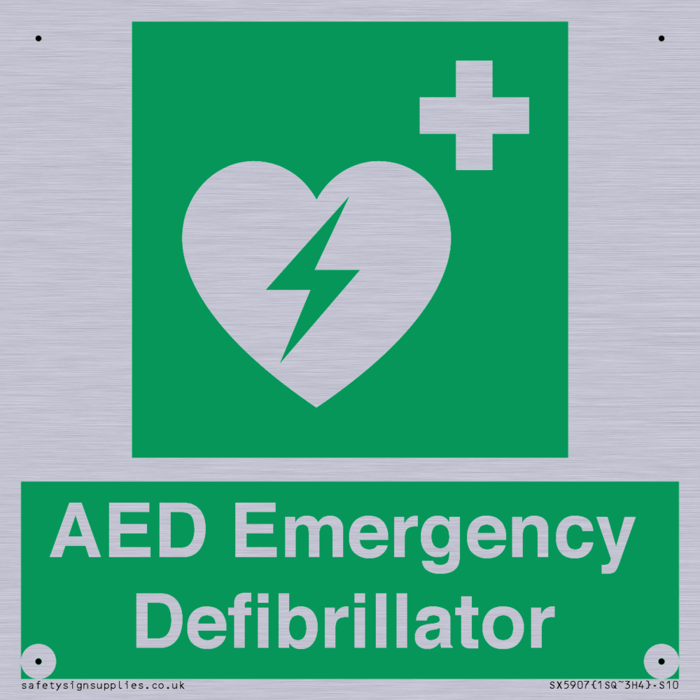 Sign Text: AED Emergency Defibrillator Dimensions: 100x100mm Material: Grained Silver Aluminium Orientation: Square Text Colour: White Background Colour: Green More...