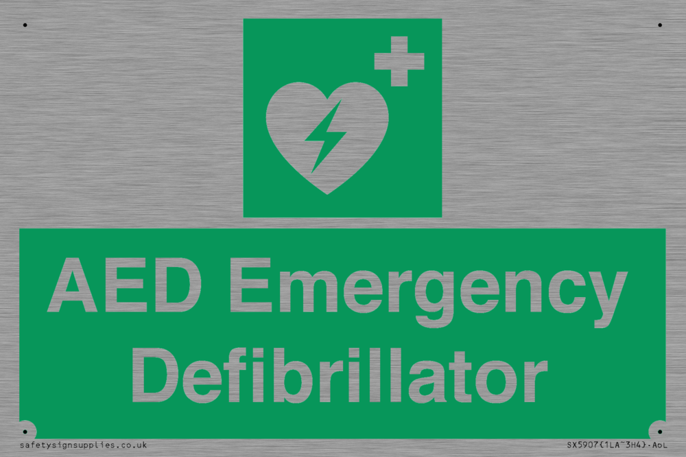 Sign Text: AED Emergency Defibrillator Dimensions: 150x100mm Material: Stainless Steel Orientation: Landscape Text Colour: White Background Colour: Green More...