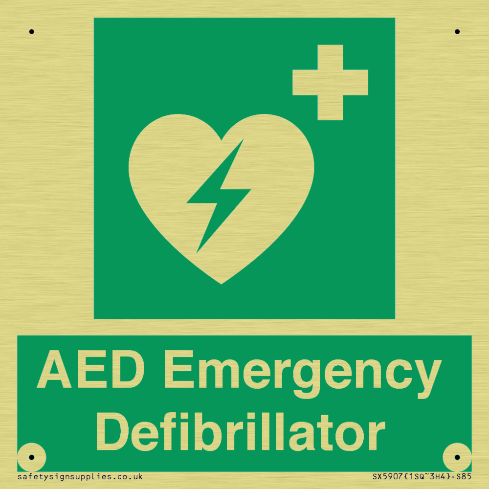 Sign Text: AED Emergency Defibrillator Dimensions: 85x85mm Material: Champagne Aluminium Orientation: Square Text Colour: White Background Colour: Green More...