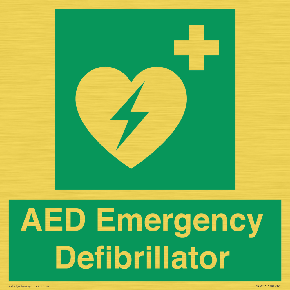 Sign Text: AED Emergency Defibrillator Dimensions: 200x200mm Material: Plastic Semi-rigid Gold Orientation: Square Text Colour: White Background Colour: Green More...
