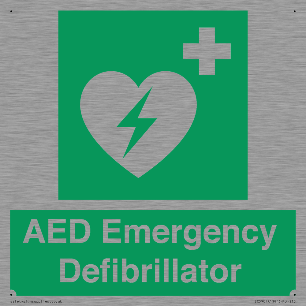Sign Text: AED Emergency Defibrillator Dimensions: 150x150mm Material: Stainless Steel Orientation: Square Text Colour: White Background Colour: Green More...
