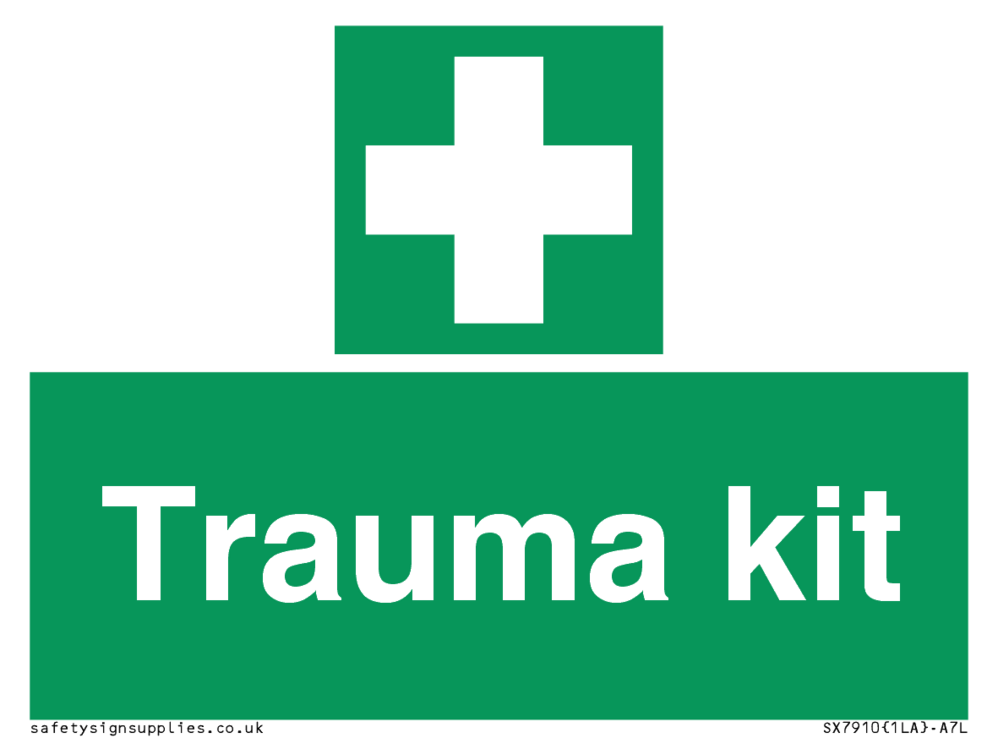 This sign contains a first aid symbol - universal first aid cross in white on green background.