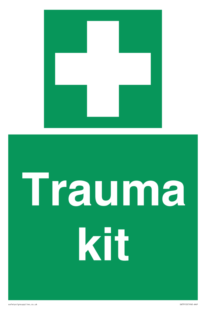 This sign contains a first aid symbol - universal first aid cross in white on green background.