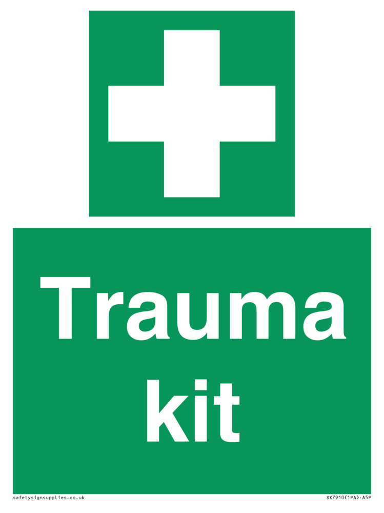 This sign contains a first aid symbol - universal first aid cross in white on green background.