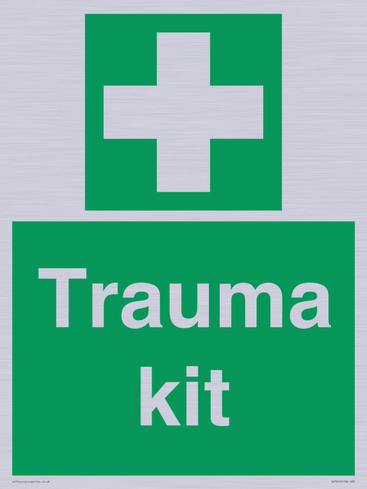 This sign contains a first aid symbol - universal first aid cross in white on green background.