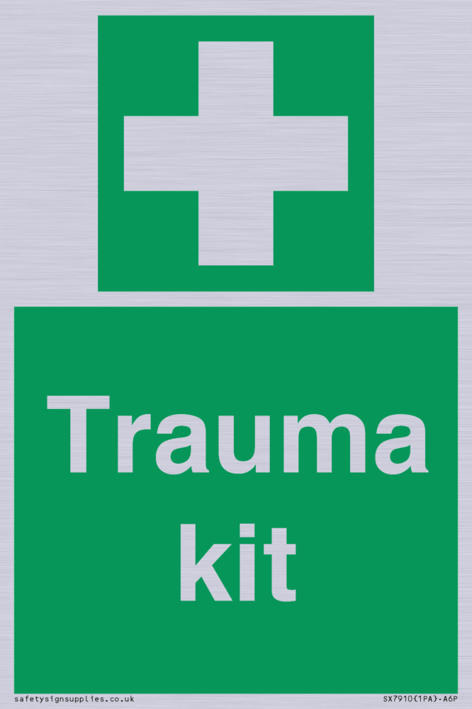 This sign contains a first aid symbol - universal first aid cross in white on green background.