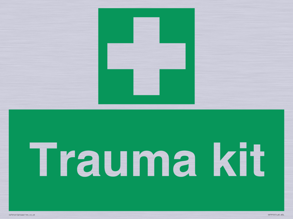This sign contains a first aid symbol - universal first aid cross in white on green background.