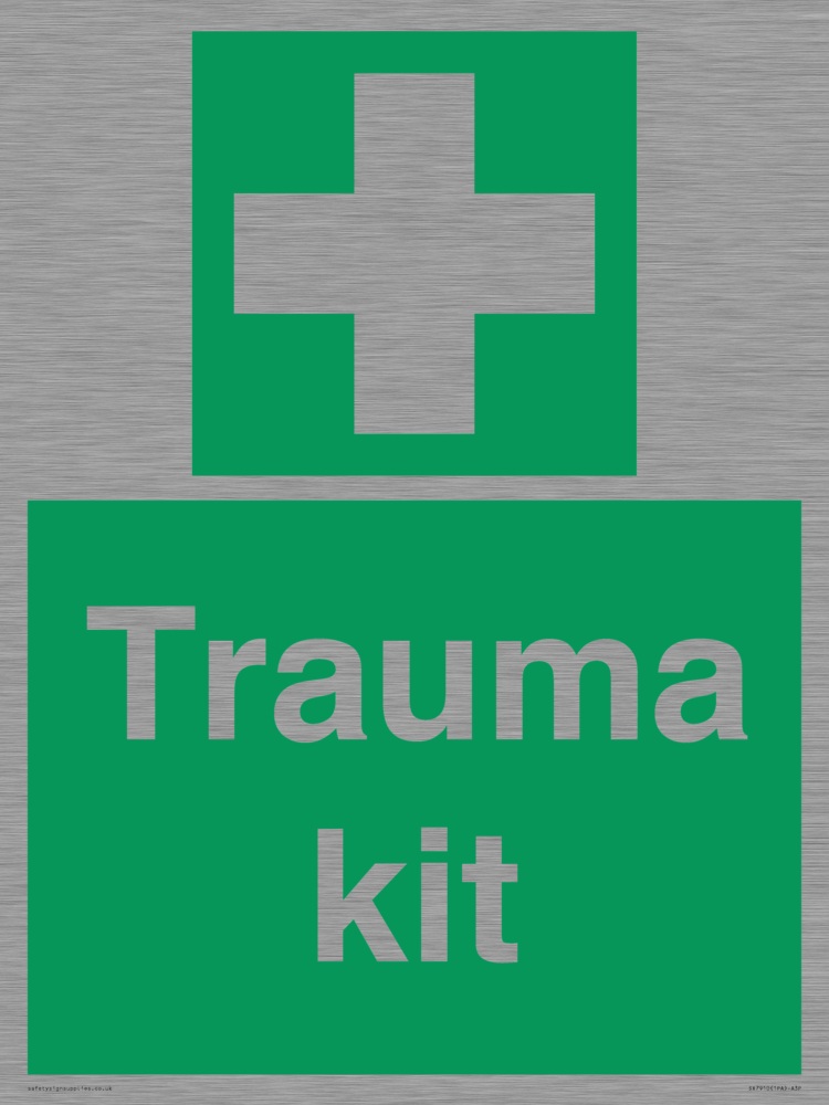 This sign contains a first aid symbol - universal first aid cross in white on green background.