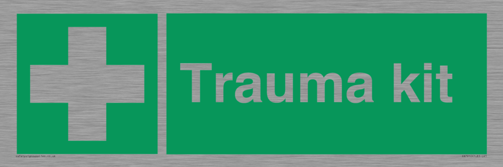 This sign contains a first aid symbol - universal first aid cross in white on green background.