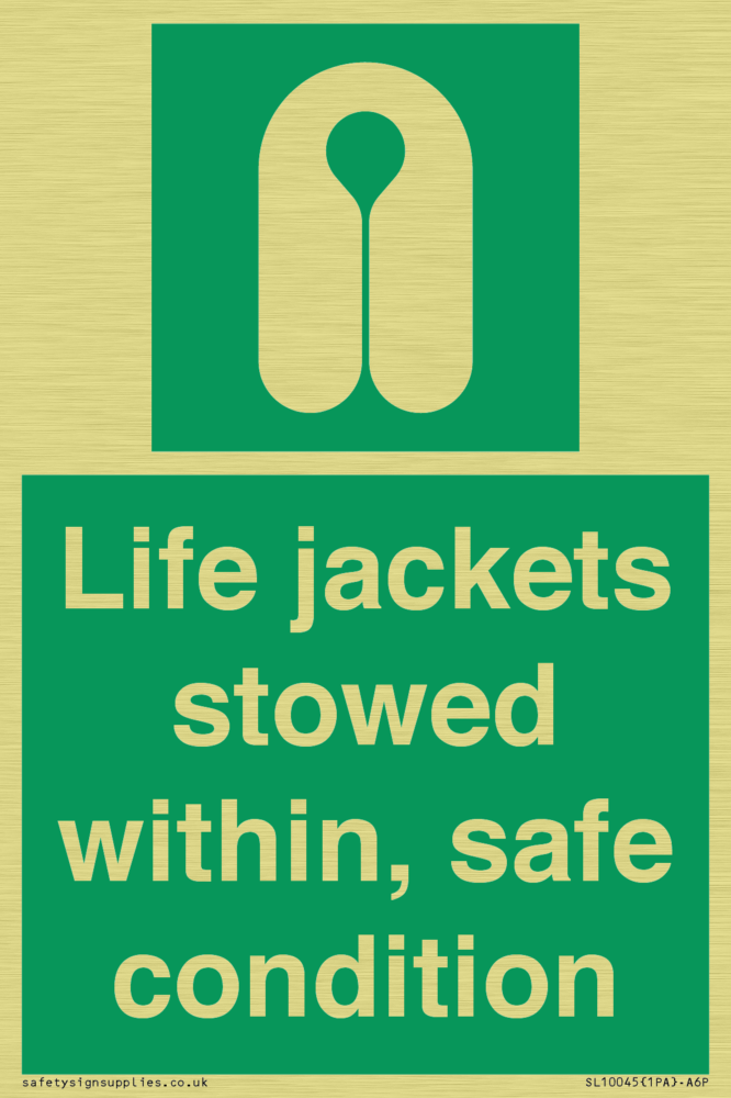 Sign Text: Life jackets stowed within, safe condition