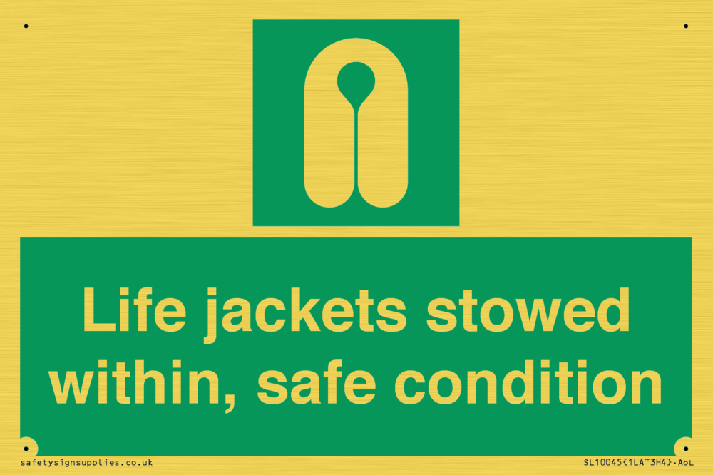 Sign Text: Life jackets stowed within, safe condition