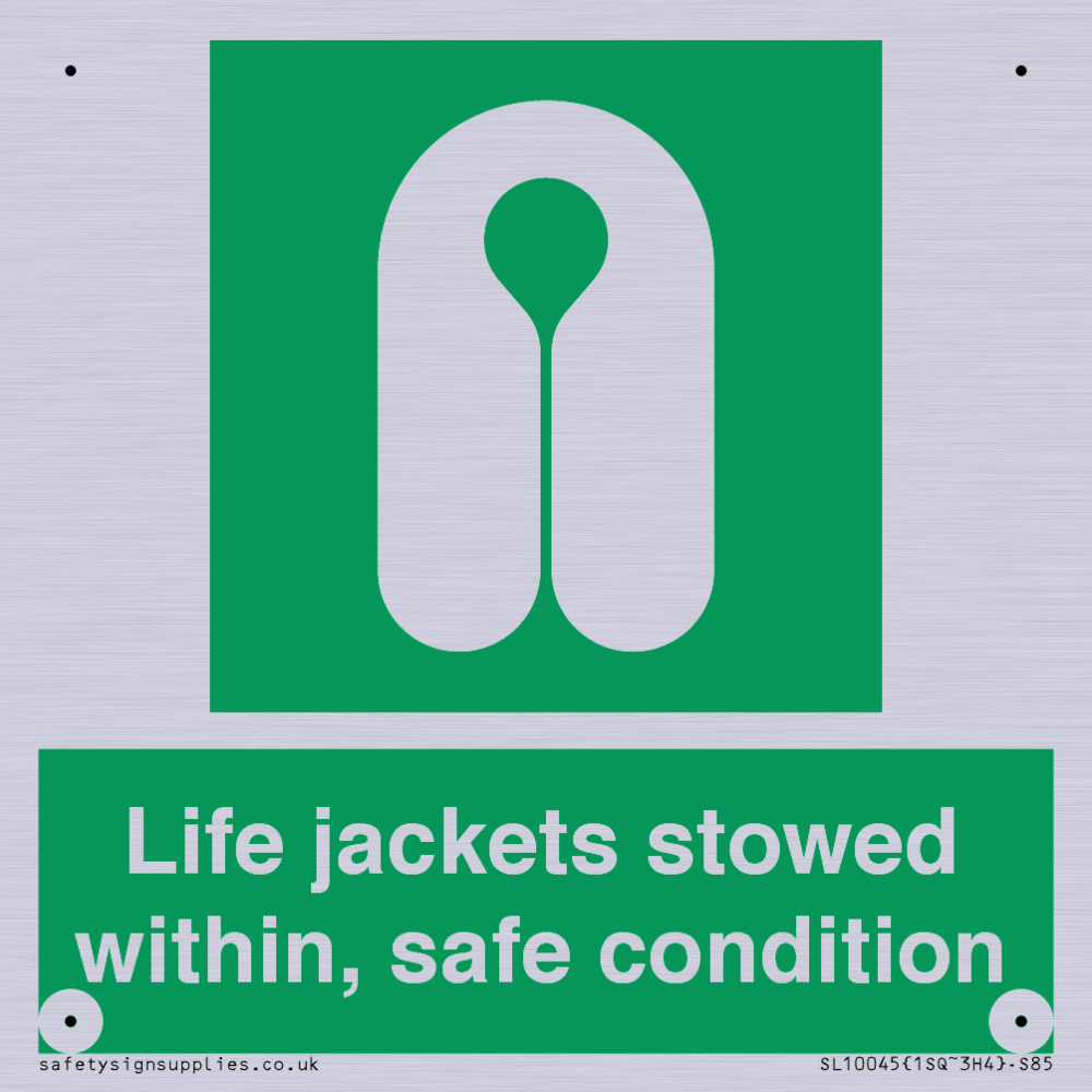 Sign Text: Life jackets stowed within, safe condition