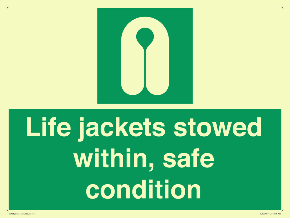 Sign Text: Life jackets stowed within, safe condition