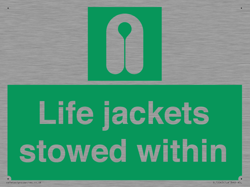 Sign Text: Life jackets stowed within, safe condition