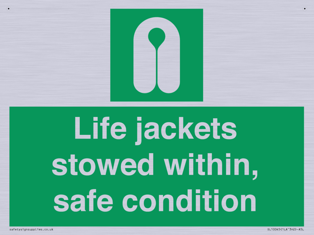 Sign Text: Life jackets stowed within, safe condition