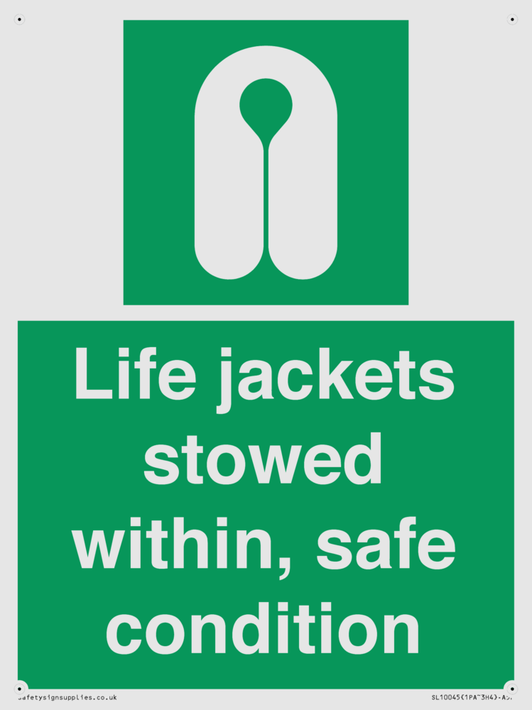 Sign Text: Life jackets stowed within, safe condition