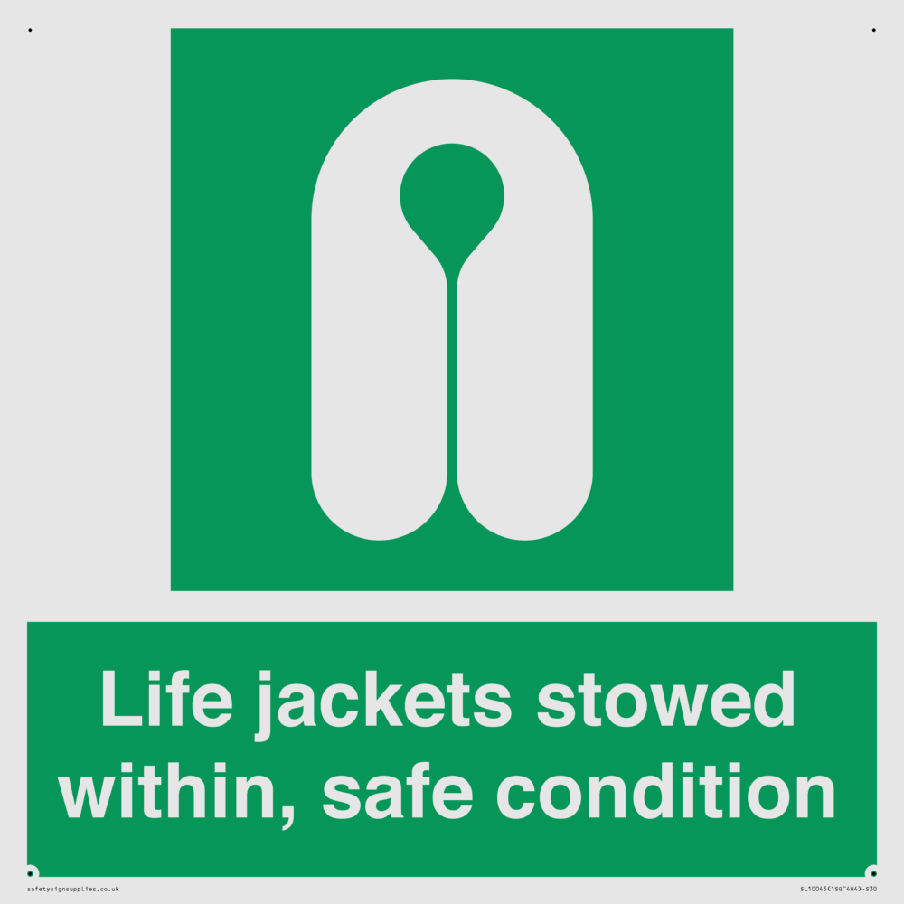 Sign Text: Life jackets stowed within, safe condition