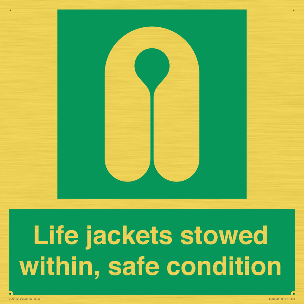 Sign Text: Life jackets stowed within, safe condition
