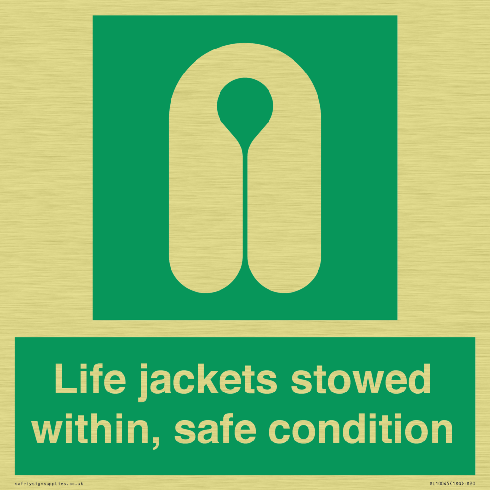 Sign Text: Life jackets stowed within, safe condition