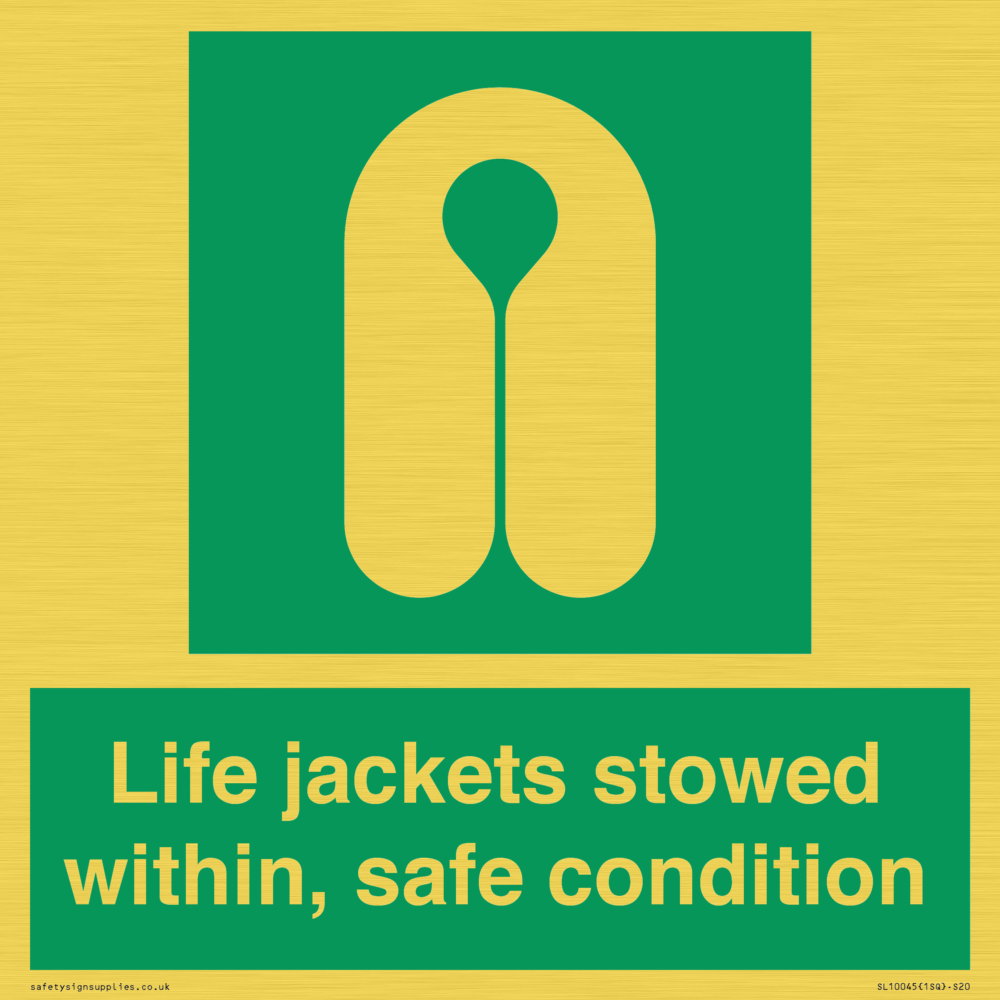 Sign Text: Life jackets stowed within, safe condition