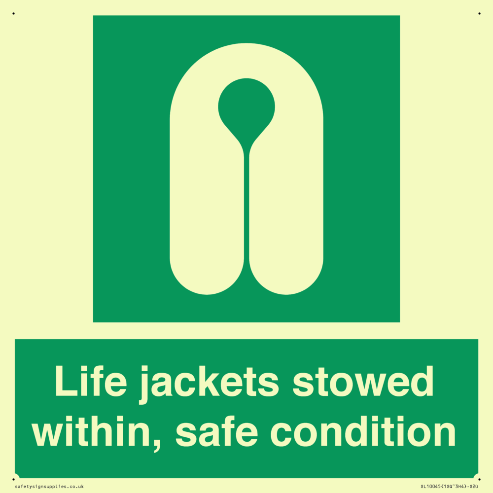 Sign Text: Life jackets stowed within, safe condition