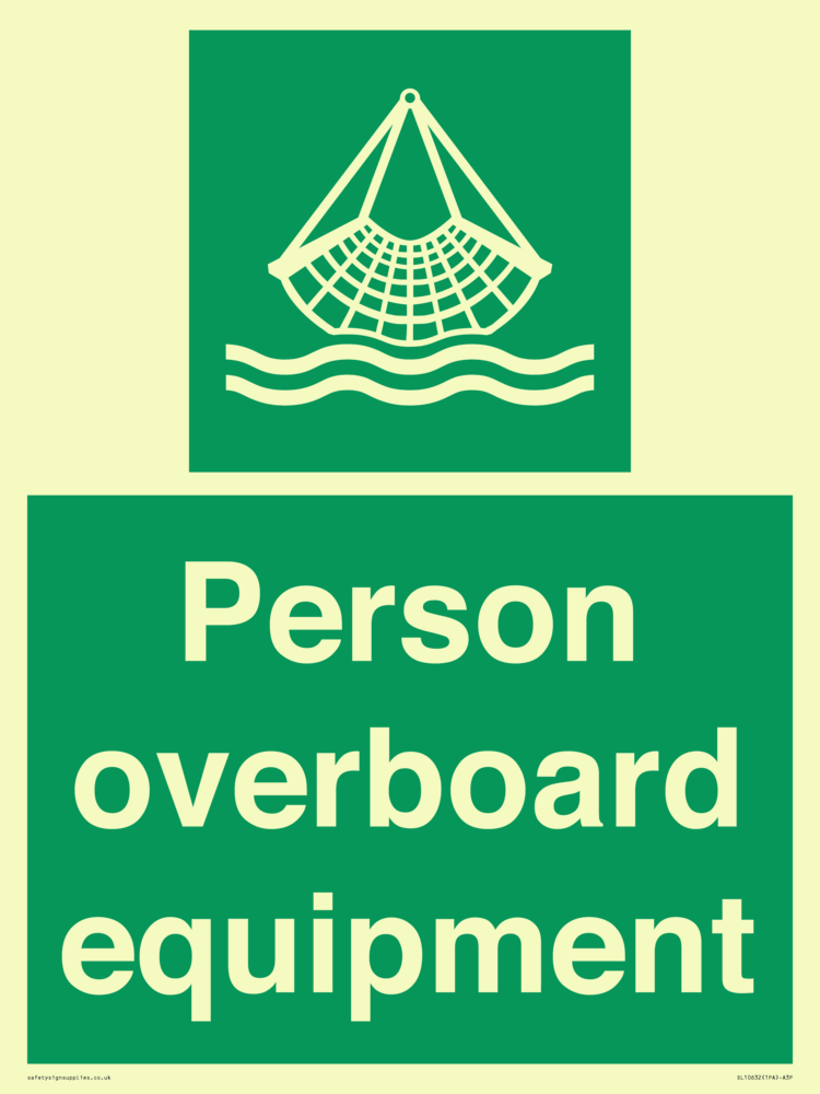 E928 Safe condition: Person overboard equipment symbol. To indicate the location of person overboard / man overboard equipment. Commonly known as a Jasons Cradle.