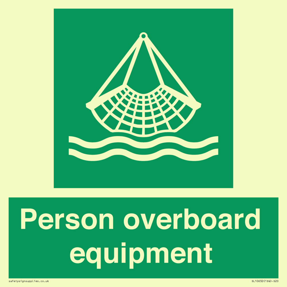 E928 Safe condition: Person overboard equipment symbol. To indicate the location of person overboard / man overboard equipment. Commonly known as a Jasons Cradle.