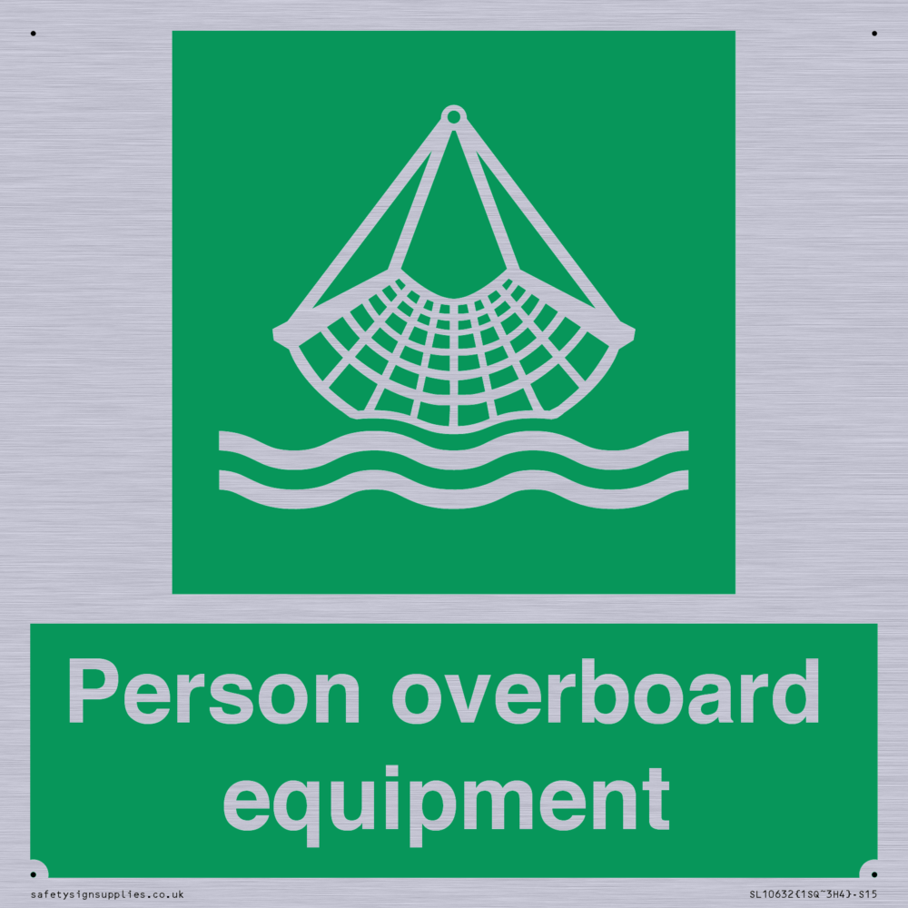 E928 Safe condition: Person overboard equipment symbol. To indicate the location of person overboard / man overboard equipment. Commonly known as a Jasons Cradle.