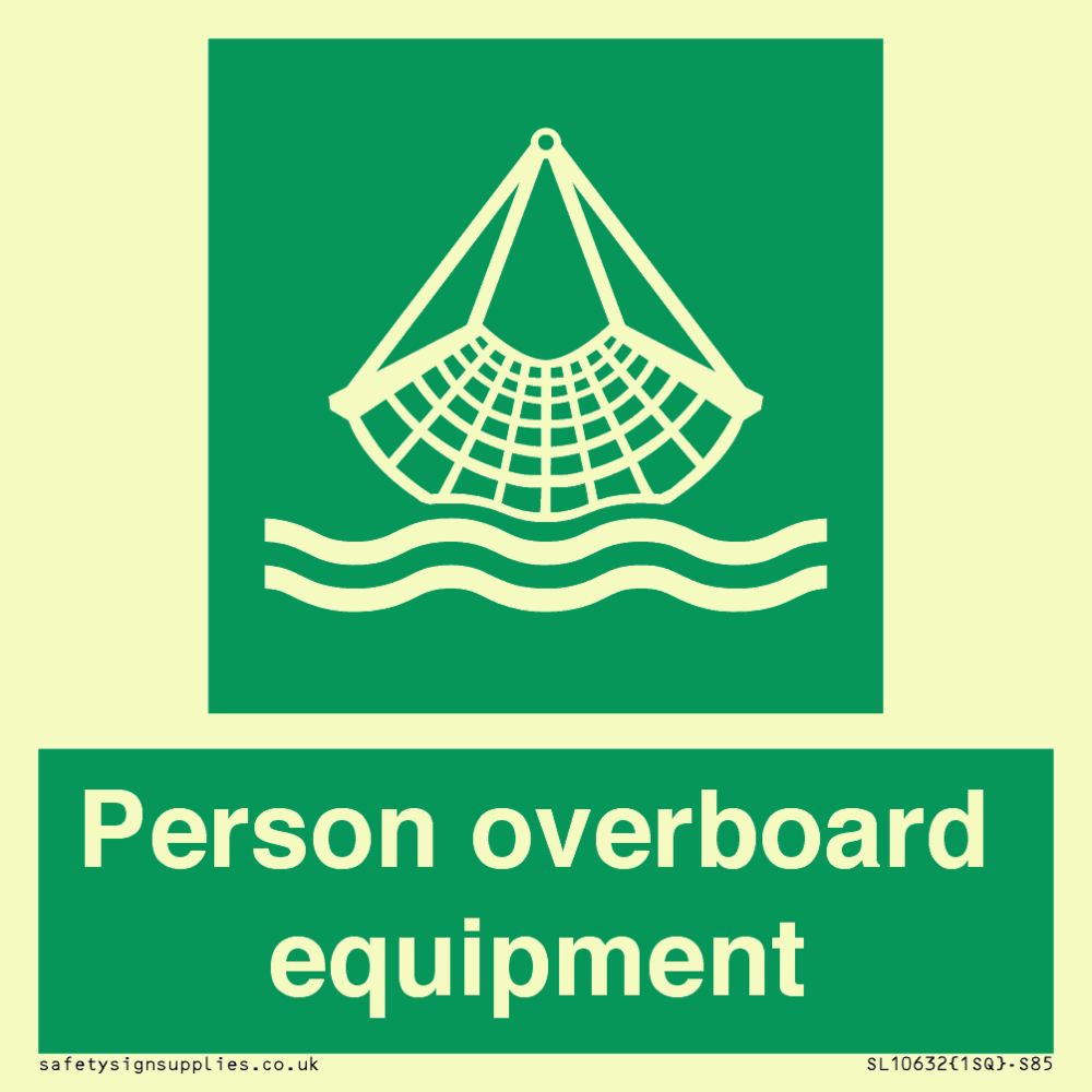 E928 Safe condition: Person overboard equipment symbol. To indicate the location of person overboard / man overboard equipment. Commonly known as a Jasons Cradle.
